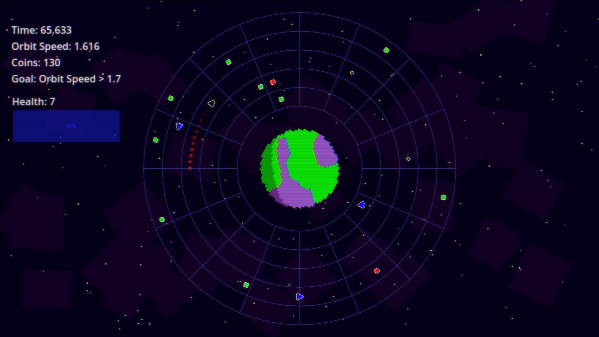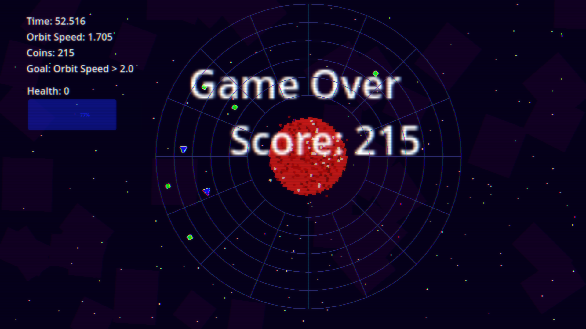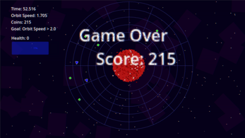 Loop around planets dodging enemies and obstacles, gaining speed to leave orbit to get to your final destination. Green coins give you speed and score! In this version play for a high score. Can you beat the creator's high score of 1125?